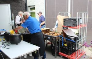 De voorbereiding Om half 12 kwamen de activiteitencommissie en een aantal vrijwilligers naar De Linde om alles voor te bereiden. Op basis van een draaiboek werden de taken verdeeld. Een groep hield zich bezig met de inrichting van de zalen en het terras. Een snijploeg wierp zich op de komkommers, tomaten, paprika’s, stokbrood en uien. De uiensnijders hebben zich manmoedig gedragen. Een bijzondere taak in de voorbereiding en uitvoering was er voor de man die alles voor de barbecue had geregeld, de vleessoorten, de gasbarbecues en de sauzen en hij stuurde ook de 4 koks aan. Deze koks konden overigens voortreffelijk barbecueën en ze bleven er vrolijk onder ondanks de warmte.